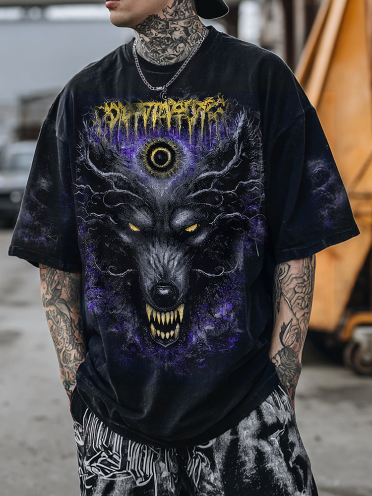 Embrace a bold look with this men's oversized T-shirt, featuring a captivating gothic wolf graphic print. The design showcases an intense wolf head with piercing yellow eyes and snarling fangs, surrounded by an ethereal purple aura, complemented by a distressed washed black background. Perfect for adding a powerful, edgy statement to your streetwear collection.