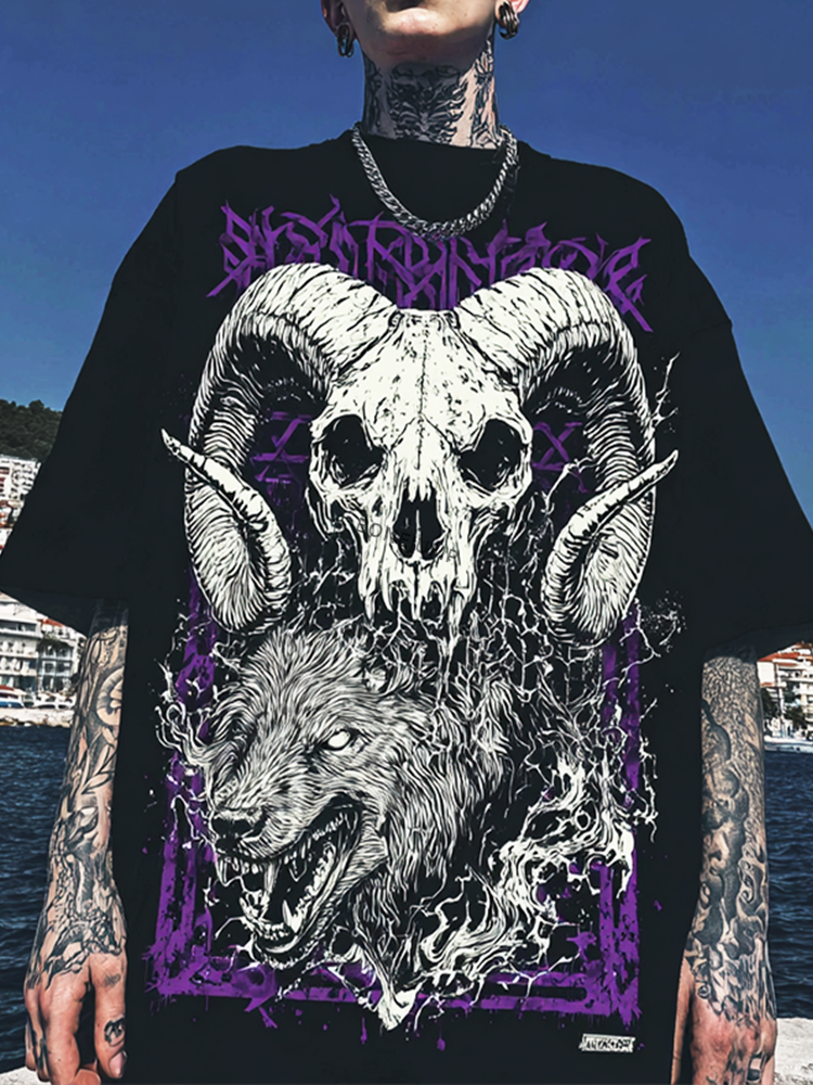 Embrace your darker side with this striking graphic t-shirt, featuring a bold design of a horned skull and a snarling wolf. Its oversized silhouette makes it perfect for a relaxed, edgy streetwear look, ideal for those who appreciate unique and impactful apparel.