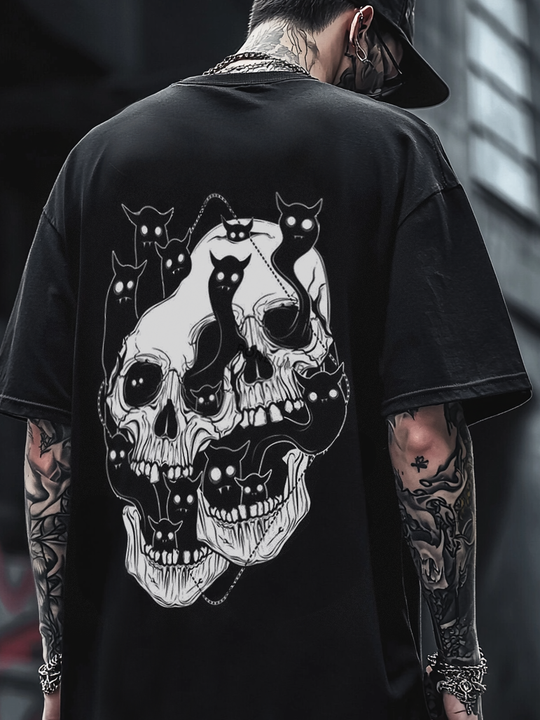 Bonejump Art Satanic Skull Black Cat Oversized Unisex Casual T-shirt